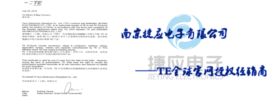 南京捷應(yīng)電子有限公司是國際無源器件品牌美國泰科電子(TE)在中國華東地區(qū)的主要通路商,代理經(jīng)銷旗下全系列產(chǎn)品包括TYCO(AMP)系列連接器、接插件、OEG、SCHRACK、P&B功率繼電器、美國RACHEM各類航空導(dǎo)線、熱縮套管、模縮套、標(biāo)識產(chǎn)品、電線電纜。